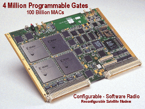 Here is an existing example of a fully programmable satellite modem. With 4 million programmable gates and the performance of 100 million programmable MACs this board is capable of implementing all of the the current products that this company has in production today. These existing designs can be modified and enhanced to rapidly deploy new products.