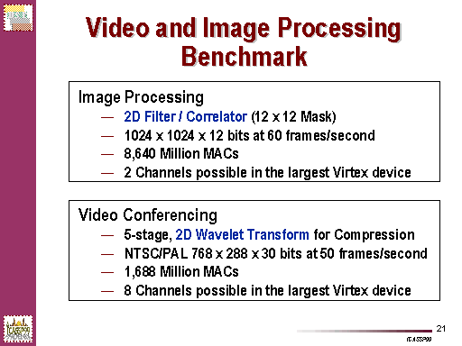 For image processing, two channels of a general purpose two dimensional FIR filters with a 12 by 12 mask and 12 bit resolution fit in a single FPGA device and can process 60 1024x1024 video frames per second.