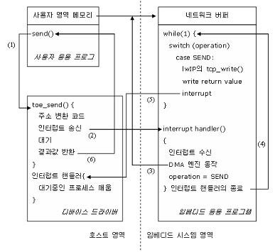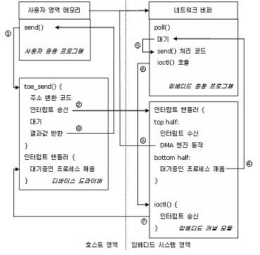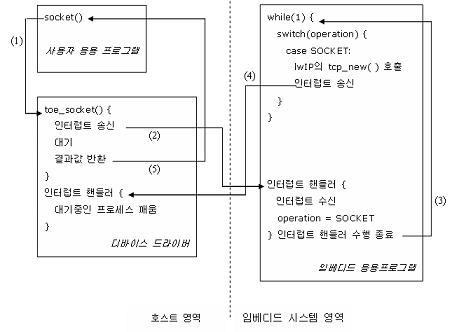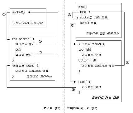 µ¿ÀÛ ¹æ½ÄÀº ´ÙÀ½°ú °°´Ù. ¸ÕÀú »ç¿ëÀÚ ÇÁ·Î±×·¥ÀÌ socket()À» È£ÃâÇϸé, BSD ¼ÒÄÏ °èÃþÀ» °ÅÃÄ µð¹ÙÀ̽º µå¶óÀ̹öÀÇ toe_socket()ÀÌ È£ÃâµÈ´Ù ¨ç. toe_socket()Àº ÀÎÅÍ·´Æ®¿Í ÇÔ²² socket()ÀÇ ÀÎÀÚ¸¦ ÀÓº£µðµå ½Ã½ºÅÛ¿¡ Àü´ÞÇϰí ÀÚ½ÅÀº ´ë±â »óÅ¿¡ Á¢¾îµç´Ù ¨è. ÀÎÅÍ·´Æ®¸¦ ¹ÞÀº ÀÓº£µðµå Ä¿³Î ¸ðµâÀº ÀÎÅÍ·´Æ® Çڵ鷯¸¦ ÅëÇØ¼ ÀÌÀü¿¡ ´ë±âÇϰí ÀÖ´ø ÀÓº£µðµå ÀÀ¿ëÇÁ·Î±×·¥À» ±ú¿î´Ù ¨é. ´ë±â»óÅ¿¡¼ ±ú¾î³ ÀÓº£µðµå ÀÀ¿ëÇÁ·Î±×·¥Àº ½ÇÁ¦ socket() ó¸® Äڵ带 ¼öÇàÇÑ´Ù ¨ê. socket()À» ó¸®ÇÏ°í ³ª¿Â ¹Ýȯ°ªÀ» ioctl()À» ÅëÇØ¼ ÀÓº£µðµå Ä¿³Î ¸ðµâ·Î Àü´ÞÇÑ´Ù ¨ë. ÀÓµ¥µðµå Ä¿³Î ¸ðµâÀÇ ioctl()Àº ÀÎÅÍ·´Æ®¸¦ ÅëÇØ¼ °á°ú°ªÀ» È£½ºÆ® ÃøÀ¸·Î Àü´ÞÇÑ´Ù ¨ì. ÀÎÅÍ·´Æ®¸¦ Àü´Þ¹ÞÀº È£½ºÆ® ÃøÀÇ ÀÎÅÍ·´Æ® Çڵ鷯´Â ´ë±â »óÅ¿¡ ÀÖ´Â toe_socket()À» ±ú¿ì°í, ´ë±â »óÅ¿¡¼ ¹þ¾î³ toe_socket()ÇÔ¼ö´Â °á°ú°ªÀ» »ç¿ëÀÚ ÀÀ¿ëÇÁ·Î±×·¥ ¿µ¿ª¿¡ Àü´ÞÇÏ¿© ±× µ¿ÀÛÀÌ ¿Ï·áµÈ´Ù ¨í.