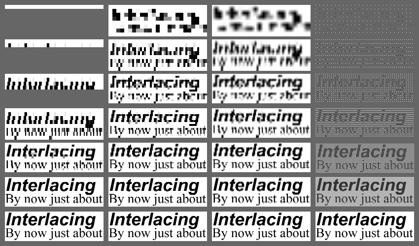 But as useful as GIF's interlacing is, it has one big disadvantage: it is not symmetric. In other words, while GIF's first pass consists of one-eighth of the image data, that factor of eight comes entirely at the expense of vertical resolution. Horizontally, every line is at full resolution as soon as it is displayed, which means that each pixel in the first pass is stretched by a factor of eight. Needless to say, this does make text and other features much harder to recognize than they really need to be.
