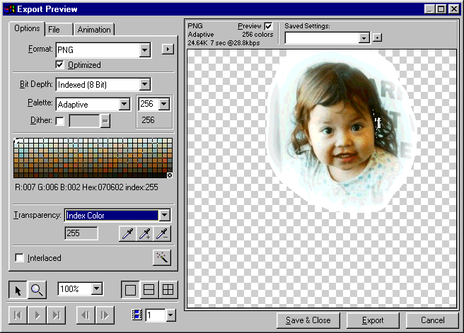With regard to transparency, the placement of transparent entries in the Export window's palette view is directly reflected in the PNG file's palette, whether Alpha Channel or Index Color is selected. This is regrettable, since the transparent colors are scattered all over the palette in the alpha case. The single-color case is even worse--the transparent color is the very last entry in the palette. As noted earlier, the preferred approach is to put all of the transparent entries at the beginning of the palette so that the redundant information about opaque colors can be eliminated from the transparency chunk. For a photographic image saved in palette format with single-color transparency, the cost is 127 or 255 bytes of wasted space.