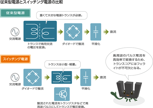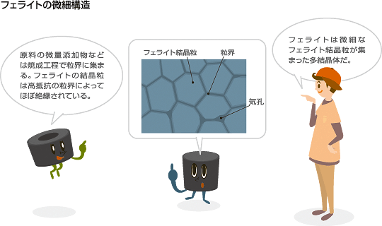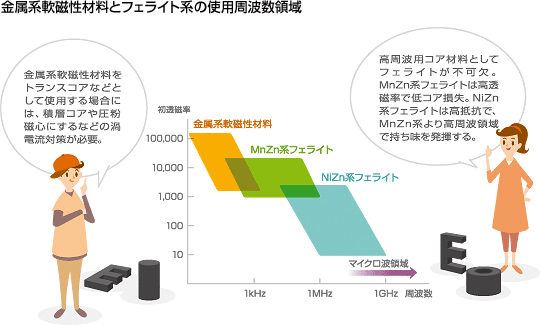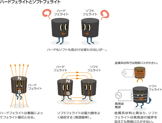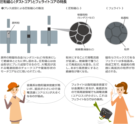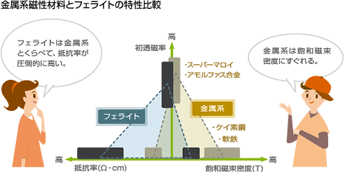 페라이트는 포화자속밀도는 금속계 코아에 비해 떨어지지만 내마모성이 좋고 전기저항이 높기 때문에 금속계 코아와는 다르게 고주파에서도 와전류손이 적은 장점이 있다.