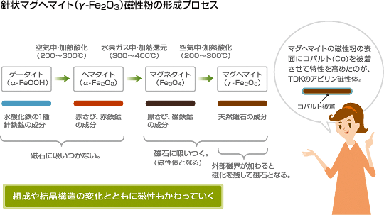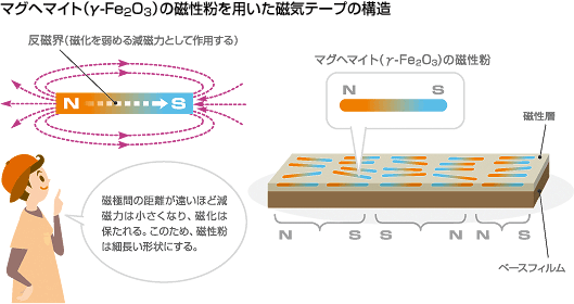한편 자기테이프에 도포되어 있는 자성분은 경자성(Hard 자성)재료이다.그러나 영구자석 정도의 큰 보자력은 가진것이 아니기 때문에 반경자성재료 등으로도 불린다(마그헤마이트의 자성분은 반경자성 페라이트이다)