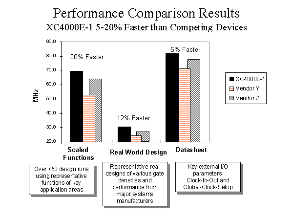 competing devices. To demonstrate XC4000E-1 performance superiority, three