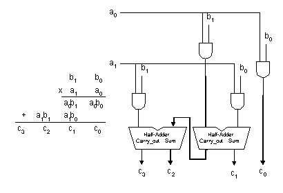 Array Multipliers are probably the most common. The multiplication of two binary numbers can be done with one sub-operation by means of a combinatorial circuit that forms the product bits all at once. This is a fast way of multiplying two numbers since all it takes is the time for the signals to propagate through the gates that construct the multiplication array. However, the array multiplier requires a large number of gates and for this reason it is not economical for MAC intensive applications. To see how the array multiplier can be implemented, consider the multiplication of two 2-bit numbers as shown in Figure 1. The Multiplicand bits are b1 and b0, the multiplier bits are a1 and a0, and the product is c3, c2, c1 and c0. The first partial product is formed by multiplying a0 by b1b0 . The multiplication of two bits produces a 1 if both bits are 1, else it produces a 0. This is identical to an AND operation and can be implemented with an AND gate. As shown in Figure 1, the first partial product is formed by means of two AND gates. The second partial product is formed by multiplying a1 by b1b0 and is binary-shifted, one bit to the left. The two partial products are added with two half-adders. When there are more bits in the partial product terms, full-adders will be necessary to produce the sum. Note that the least significant bit does not need to go through an adder stage since it is formed by the output of the first AND gate.