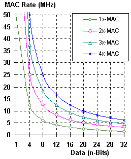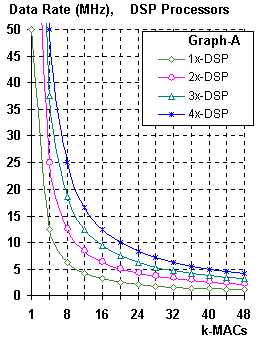 The performance, of a processor based device, can be characterized by the maximum MAC frequency divided by the number of MACs required at the Data sample rate, as shown in Figure 4-A. It can be seen that a function requiring, for example, 20-MACs per Data sample that a single processor with a 50MHz MAC frequency could support a maximum Data rate up to 2.5MHz. Two 50MHz processors are required to support a 5MHz Data rate and perform 20-MACs per sample. Four 50MHz processors are required to support a 10MHz Data rate and perform 20-MACs per sample, etc.