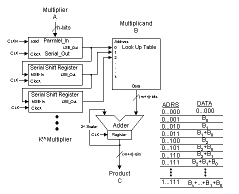 The n-bit multiplier data A0 is loaded in parallel at the data rate of CLK/n. At this time, each serial shift register holds a unique multiplier value. The LSB from each serial shift register is used to address the look up table data. The data stored in the look up table represents all possible sums of the partial products of the multiplicands.