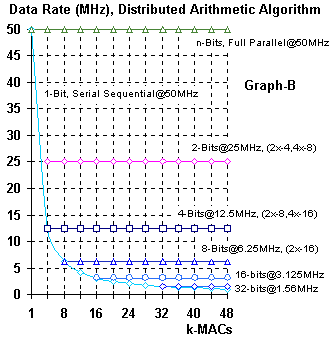 Now Distributed Arithmetic starts looking really interesting. Evaluating the process used for Serial Distributed Arithmetic. It can be seen from Figure 2 and Figure 4-B, that the determining factor in the performance of Serial Distributed Arithmetic is the number of bits representing the multiplier or Sample Data. Once the sample rate is calculated, (maximum clock rate divided by number of multiplier bits) the MAC rate is constant, as shown in Figure 4-B.