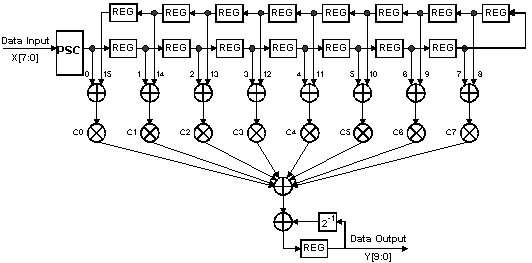 A 16-Tap, 8-Bit Finite Impulse Response (FIR) filter, will be used as an example [3]. This example will be defined to be symmetric with constant coefficients, as shown in Figure 5. The FIR filter function will be implemented in a Xilinx XC4000 FPGA, as shown in Figure 6. The construction will be based on 8-Tap FIR filter building blocks to permit easy design reuse and expansion. The building blocks allow any multiple of 8-Tap FIR filters to be constructed with only minor changes to the control logic to support additional stages.