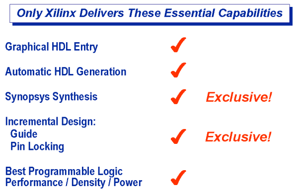 Xilinx's superior HDL solution features graphical HDL entry, automatic HDL generation, and advanced synthesis technology from Synopsys to enable VHDL design in minutes. Advanced M1 device implementation software and unsurpassed pin-locking capabilities combine to reduce runtimes and shorten design iterations to less than ten minutes. Xilinx's XC4000XL FPGA and XC9500 CPLD technologies deliver the best combination of design performance, density, and power in the industry. |