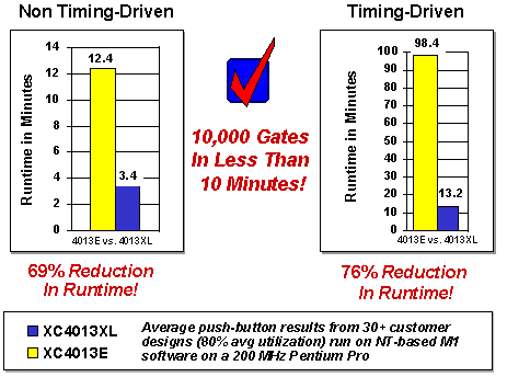 The second aspect of performance is run time improvements. In these graphs we see the comparison of the existing 4013E devices compared to the new 4013XL devices, which were modeled using our device modeling capabilities. They represent the second release of software optimized for software. For this suite of designs, we’ve used average push button results from over 30 customer designs, averaging over 80% utilization, run on the NTbased M1 software on a Pentium pro. The left graph shows the average time of those 30 designs run in non-timing driven mode. And you can see that the 4013E’s ran in an average of 12.4 minutes. The 4013XL’s ran in under 4 minutes, which represents an average reduction of over 69% in run time. In the right graph you can see that in timing driven mode, the 4013E’s took nearly 100 minutes on average to route, where the 4013XL’s routed in 13 minutes, a 76% reduction in run time. The tests are reproducible, and the data speaks for itself; the tools route ten thousand gates in less than ten minutes. |