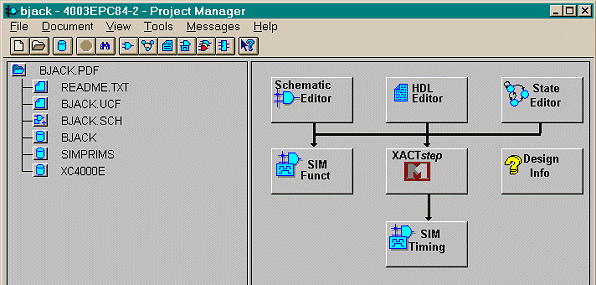 | The left hand side of the Project Manager illustrates the design files which are associated with a project. These files include both Schematic and HDL files. The right hand side of the Project Manager illustrates the Xilinx design flow. This flow also enables direct invocation of the various design tools. |