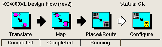| The Flow Engine illustrates the processes which occur in the implementation of a Xilinx programmable logic device. This illustration shows an FPGA design flow which has been successfully translated and mapped, and is currently being placed and routed. |