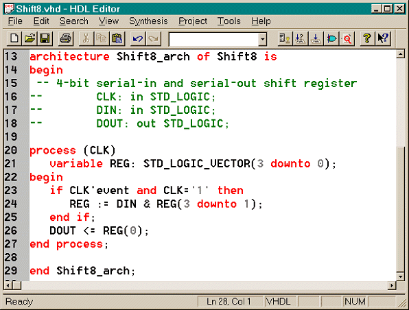 | The HDL Editor may be used for authoring VHDL, Verilog or ABEL designs. The HDL Editor's color coding understands the Key Words, comment characters and variable syntax of each of these languages. This diagram illustrates the inclusion of a Shift Register from the Language assistant. Green colored items are comments, Red colored items are VHDL Key Words, and items colored in Black are variables. |