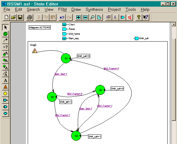 | The State Diagram Editor provides another method for reducing the HDL learning curve for designers who are new to language based design. Here, a bubble diagram is used to construct a designs state machine which may be encoded using a variety of schemes. Transition statements and signal assignments are all readily applied using the easy to use State Diagram Editor widgets. |
