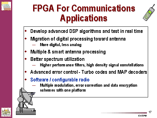 ãSoftware radioä now becomes ãconfigurable radioä. FPGAs process data sample rate above 100 MHz. Satellite modems, cellular infrastructure, and military radios will be among the first to benefit from a fully programmable solutions